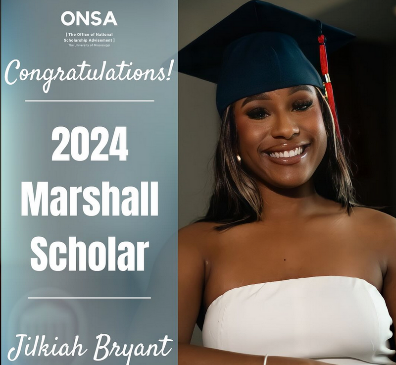 OXFORD, Miss. – The British government has named University of Mississippi alumna Jilkiah Bryant as a winner of a prestigious Marshall Scholarship, making her the third Marshall Scholar in the university’s history. Bryant, a 2023 graduate with a degree in public health and health sciences, plans to spend the next two years studying community health in England. As a Marshall Scholar, she will study Health Economics at the University of Sheffield, and Health and International Development at London School of Economics.